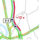 Falls ein Stau detektiert wird, der einen Reisezeitverlust von mehr als 5 Minuten mit sich bringt, wird diese Verlustzeit in der Karte als gerundeter Zahlenwert zusätzlich angegeben.