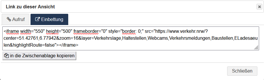 Öffnen Sie das Menü auf der linken Seite des Bildschirms. Gehen Sie dort zum Menüpunkt „Link zu dieser Ansicht“ und wählen Sie den Reiter „Einbettung“. Hier erhalten Sie das fertige iframe-Tag inklusive der eingestellten Parameter, das Sie einfach herauskopieren können.