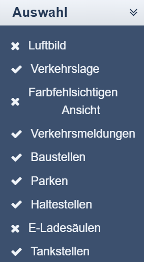 Auch im Layer-Menü springt der Fokus nach dem Öffnen zuerst auf den Schließen-Button. Mit den Tasten Tab, Shift oder den Pfeiltasten (oben/unten) können Sie folgende Layer auswählen: Luftbild, Verkehrslage, Ansicht für Farbfehlsichtige, Verkehrsmeldungen, Baustellen, Parken, Haltestellen, E-Ladesäulen, Tankstellen. Aktivieren Sie den jeweiligen Layer durch Drücken der Leertaste oder Enter-Taste.