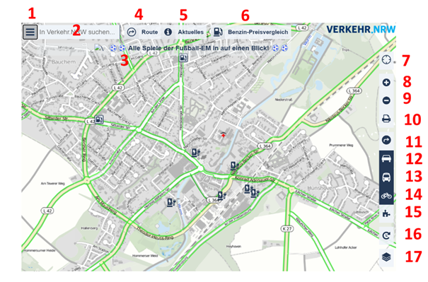 Verkehr.NRW produziert selbst keine Daten. Alle auf Verkehr.NRW angezeigten Daten zu Mobilität und Verkehr liefern die Betreiber. Wir verlassen uns dabei auf qualitativ hochwertige Datenquellen. Verkehrsmeldungen, Warnhinweise und Staunachrichten erreichen uns bundesweit über die Autobahn GmbH, die Polizei und © TomTom. Über Sperrungen und Baumaßnahmen in ganz Nordrhein-Westfalen informieren Straßen.NRW und die Landesverkehrszentrale. Nachrichten zum regionalen öffentlichen Personennahverkehr kommen von den Verkehrsverbünden NRW (© VRR; © VRS). Die Quelle der Luftbilder ist © Geobasis NRW. Daneben nutzen wir noch zahlreiche andere Datenquellen, um ein möglichst umfangreiches Informationsangebot für Verkehrsteilnehmende in NRW sicher zu stellen.